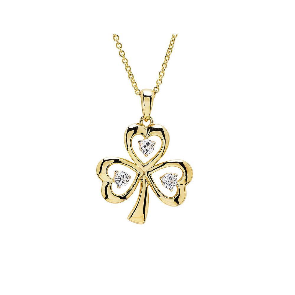 This charming necklace features a polished shamrock with heart-shaped leaves, each accented by a lab-created white sapphire for a soft sparkle. Crafted in 14kt gold vermeil, it includes an 18” cable chain, 2” extender, and lobster catch. A symbol of Irish pride and good fortune, this joyful piece adds a meaningful touch to any jewelry assortment. We can also supply the matching earrings -drops and studs- for a complete set option.