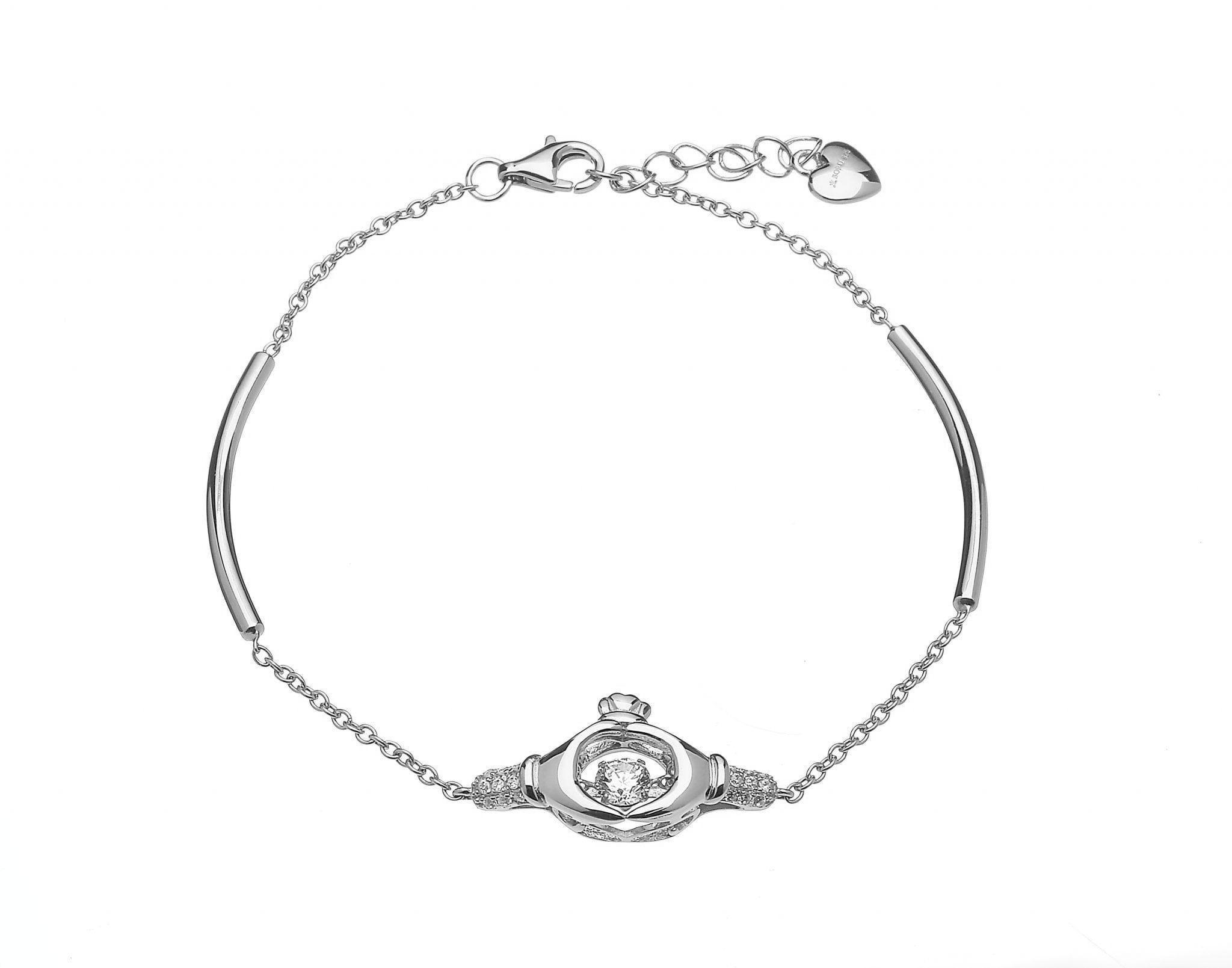 This Dancing Stone Claddagh Bracelet is part of Boru’s Damhsa – Dancing Stone Collection. The centre CZ stone literally ‘Dances’ with movement, making it sparkle and shimmer. This Celtic Bracelet incorporates a traditional Irish Claddagh symbol along with clear CZ stones along the sides.