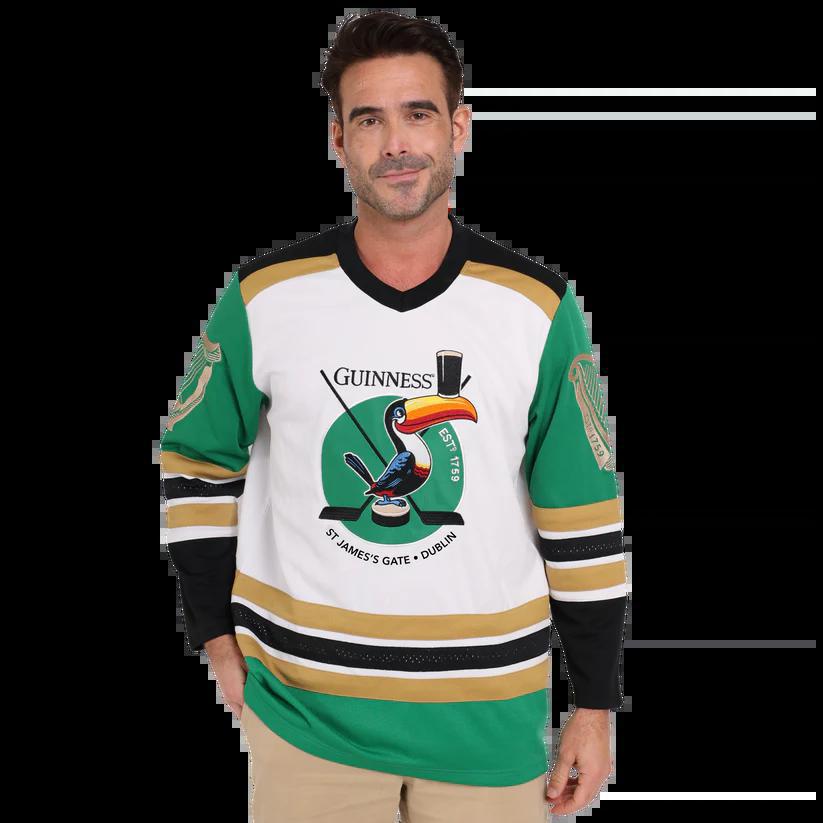 The Guinness Toucan Hockey Jersey is a striking and iconic piece that seamlessly blends the rich heritage of Guinness with a sporty and stylish design. Crafted in a classic hockey jersey silhouette and made from 100% recycled polyester, this jersey not only pays homage to the brand’s rich heritage but also reflects a dedication to environmental responsibility.