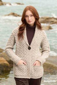 Charming heart-design cardigan with a one-button closure, knitted using a mix of traditional Aran cable stitches and a heart design pattern. This Irish cardigan also features patch pockets for added comfort.