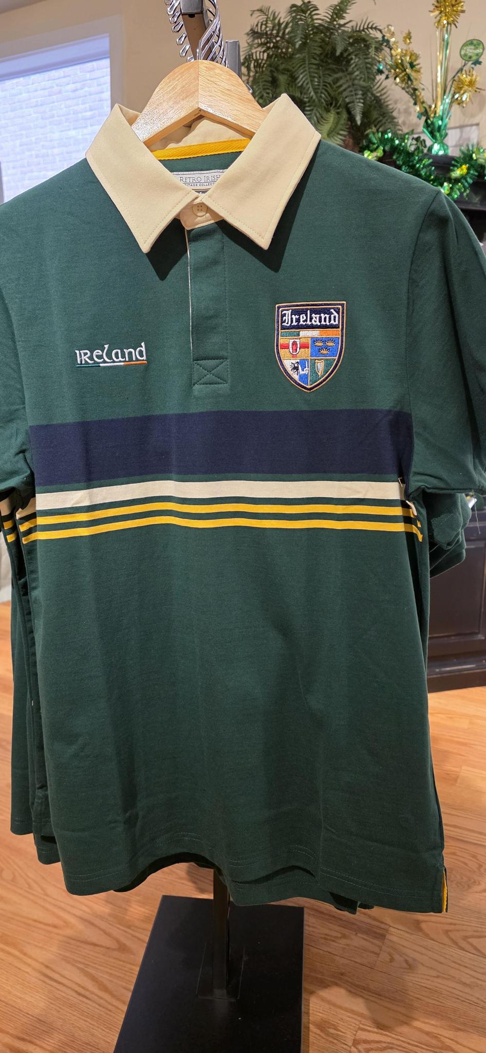 Retro Irish Men’s Polo Rugby Shirt with cut ‘n’ sew stripes and a contrast placket and collar. This 260gsm cotton polo rugby shirt is a comfortable, durable garment. Embroidered designs, badges and a tailored collar add to a high quality finished garment.