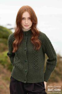 This Ladies’ wide-waistband Aran cardigan crafted with traditional Aran stitches. The wide waistband adds structure and elegance, while the rich texture of the knit creates a cozy, timeless piece ideal for layering or wearing on its own.