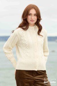 This Ladies’ wide-waistband Aran cardigan crafted with traditional Aran stitches. The wide waistband adds structure and elegance, while the rich texture of the knit creates a cozy, timeless piece ideal for layering or wearing on its own.
