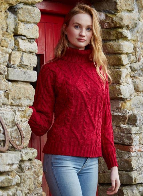 Traditional stitches are used throughout this garment. The beautifully soft Merino wool in the high collar gives this sweater extra warmth, and when added to the traditional stitches that have been used a story is told by the wearer. The cable stitches symbolise the Fishermans ropes, and the centre panel with the diamond stitch represents wealth or success. The pattern used on the back reflects the same one that has been used on the front. The sleeves have a mixture of cables, diamonds and basket stitches. All these stitches combined together tell a story, maybe giving the wearer the ‘gift o’ the gab!!’